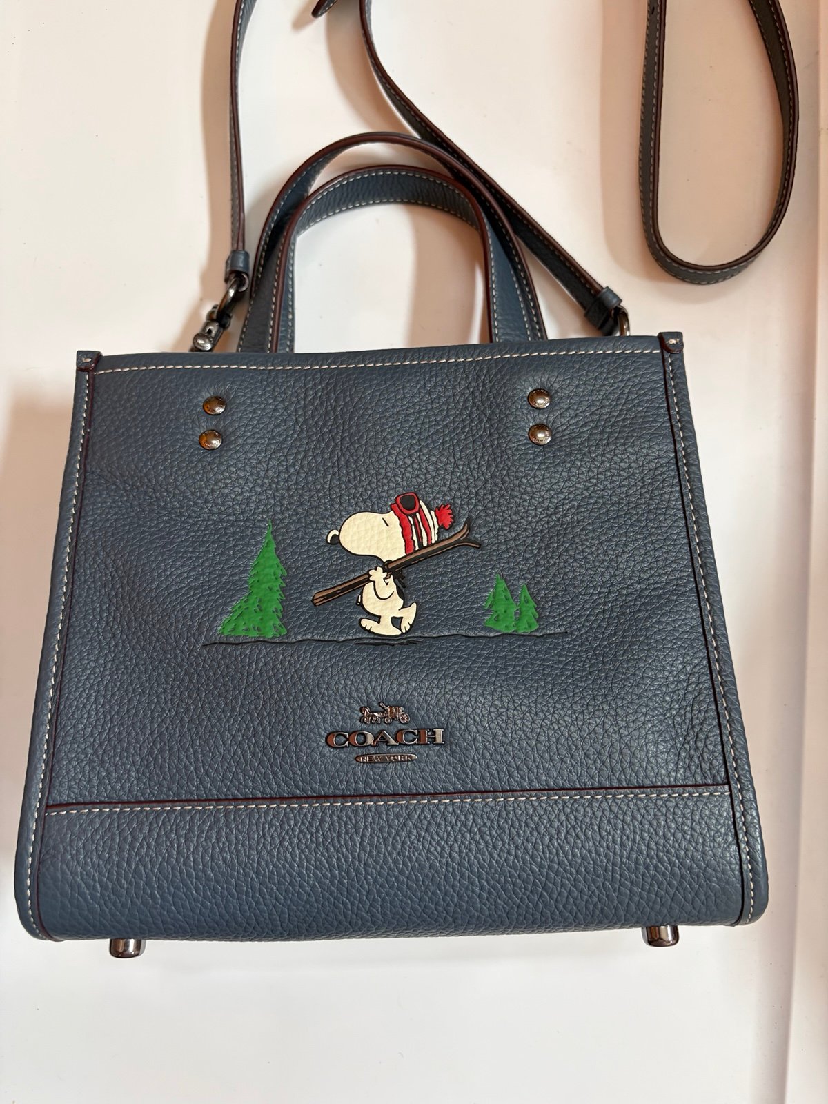 NWT Coach X Peanuts Dempsey Tote 22 With Snoopy Ski Motif in refined pebble leather with snap closure. Bag has an inside zip and multifunction pockets and fabric lining.