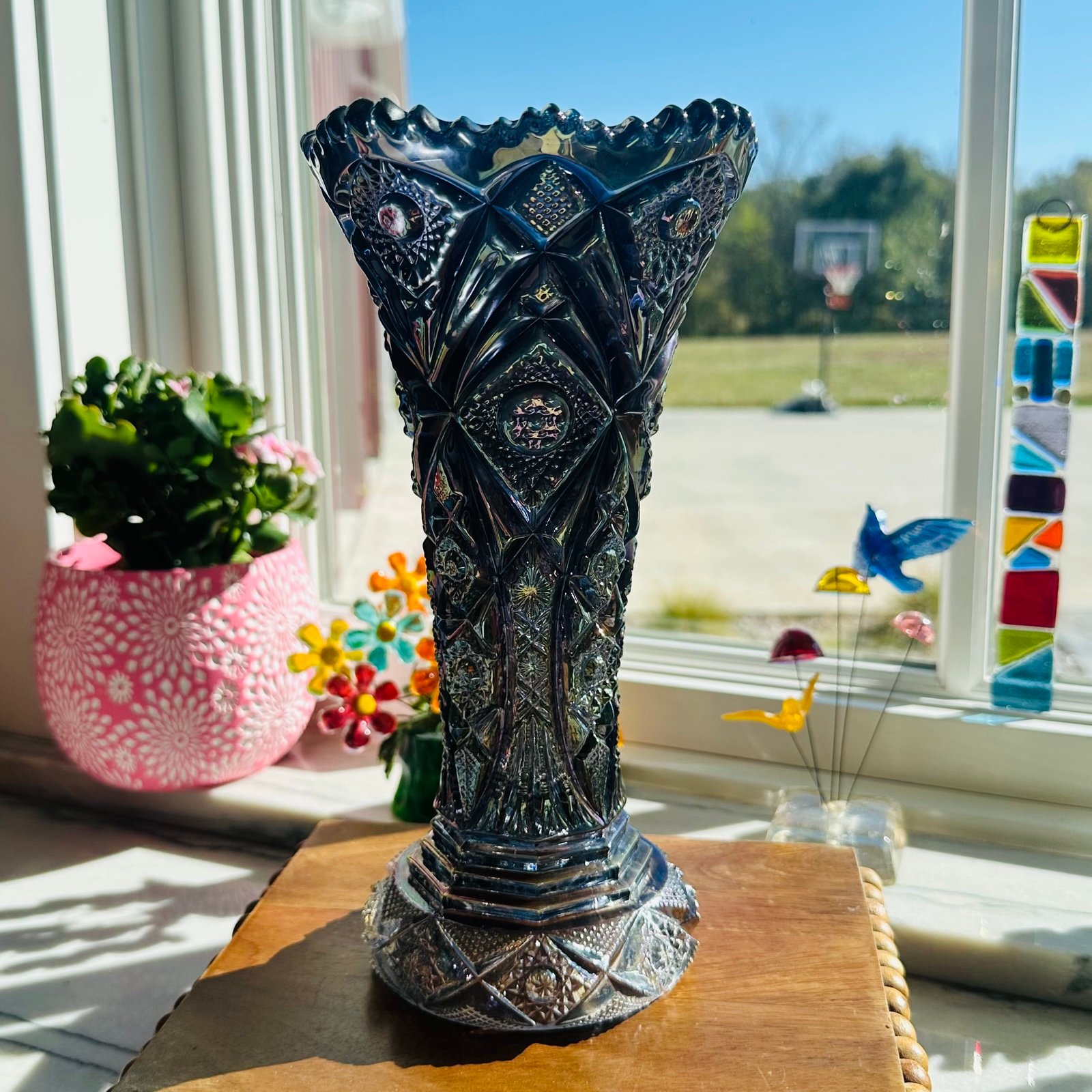 This is a vintage carnival glass vase made by the Imperial glass company. Gorgeous iridescent purple color. This vase is in excellent pre-owned condition. No chips, cracks or breaks